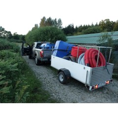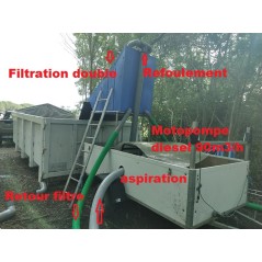 SKIMCRUSH PRO 90, gros débit et autonome, 90 m3/h et moteur diesel. Double filtre Skimfilter max. Double corole d'aspiration sur chariot avec 12.5 m tuyau d'aspiration. Capacité de pompage de 5 à 20m3 par jours de lentilles égouttées ou azolla. Fabrication sur commande, délais et devis détaillé sur demande. Équipement installé sur remorque en option.
